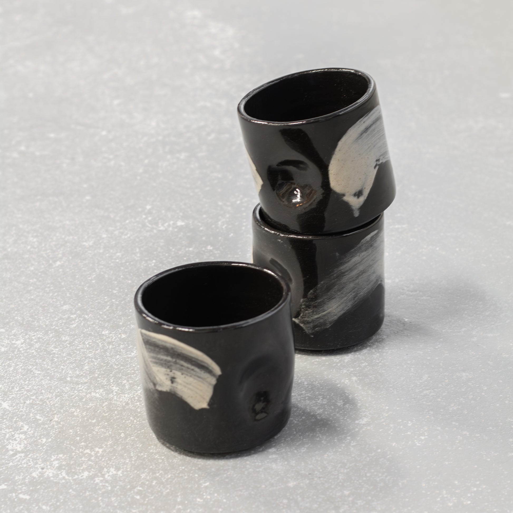 Over de zwarte klei is een slib decoratie aangebracht met beige spikkel klei. De gehele mok is afgewerkt met een transparant glanzend glazuur.
