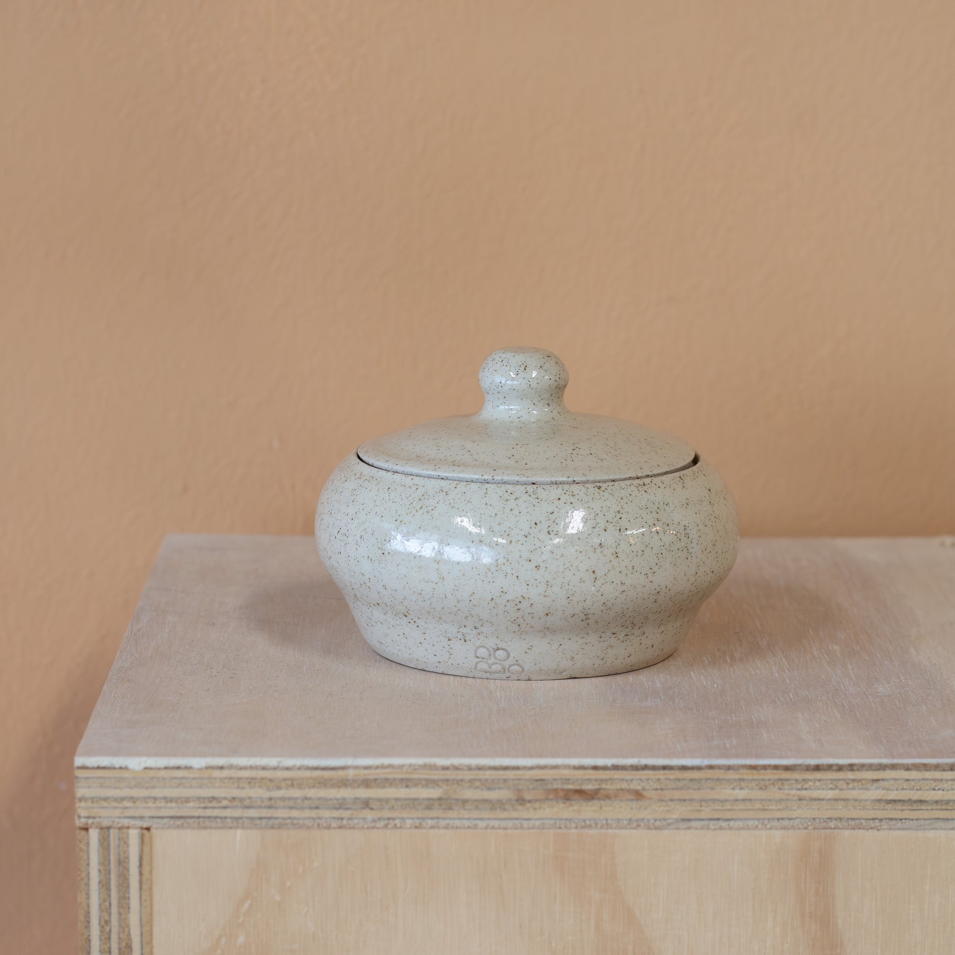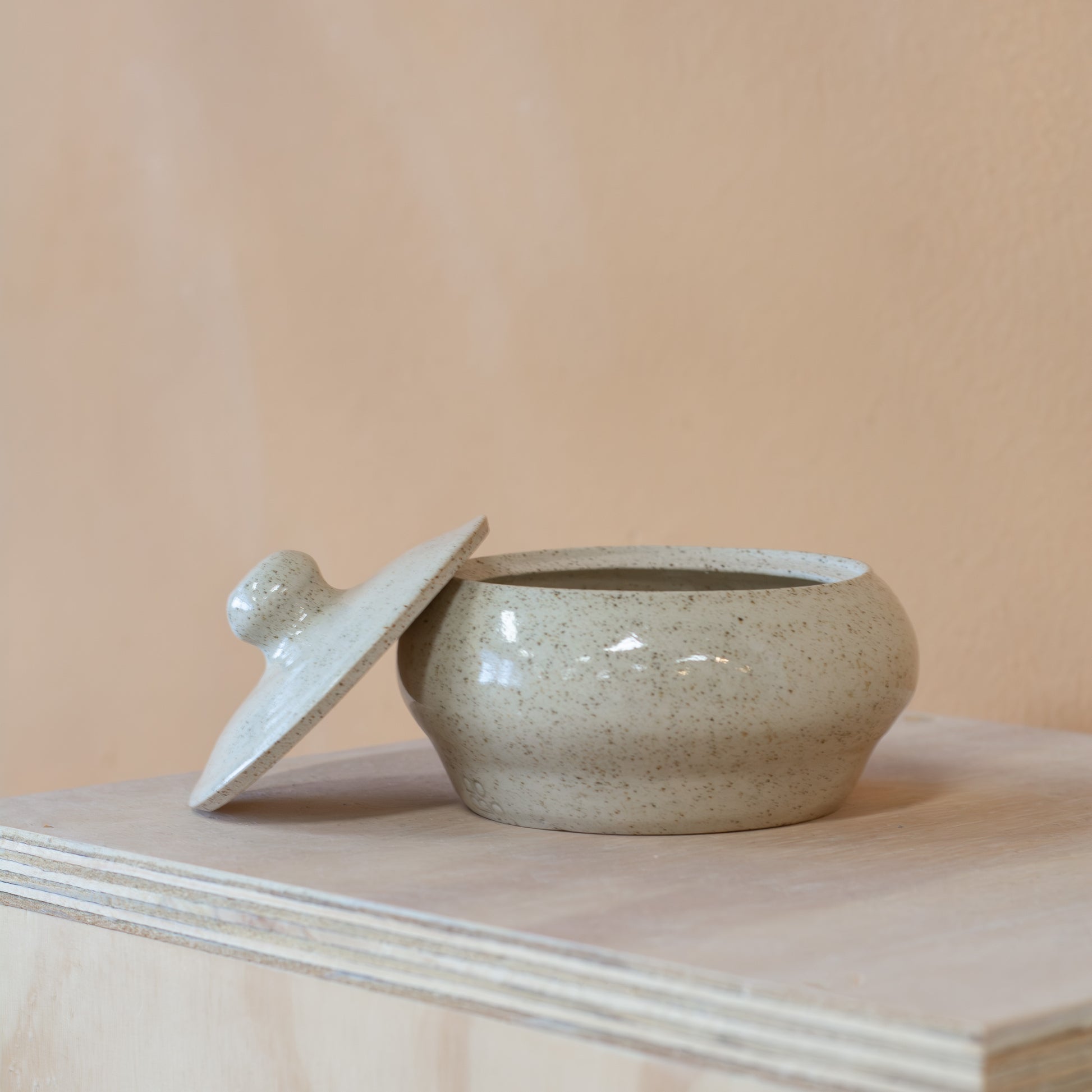 Dit gezellige potje met deksel is gedraaid van een mooie natuurlijke, subtiele spikkel klei. En daarna voorzien van een transparant glanzend glazuur.