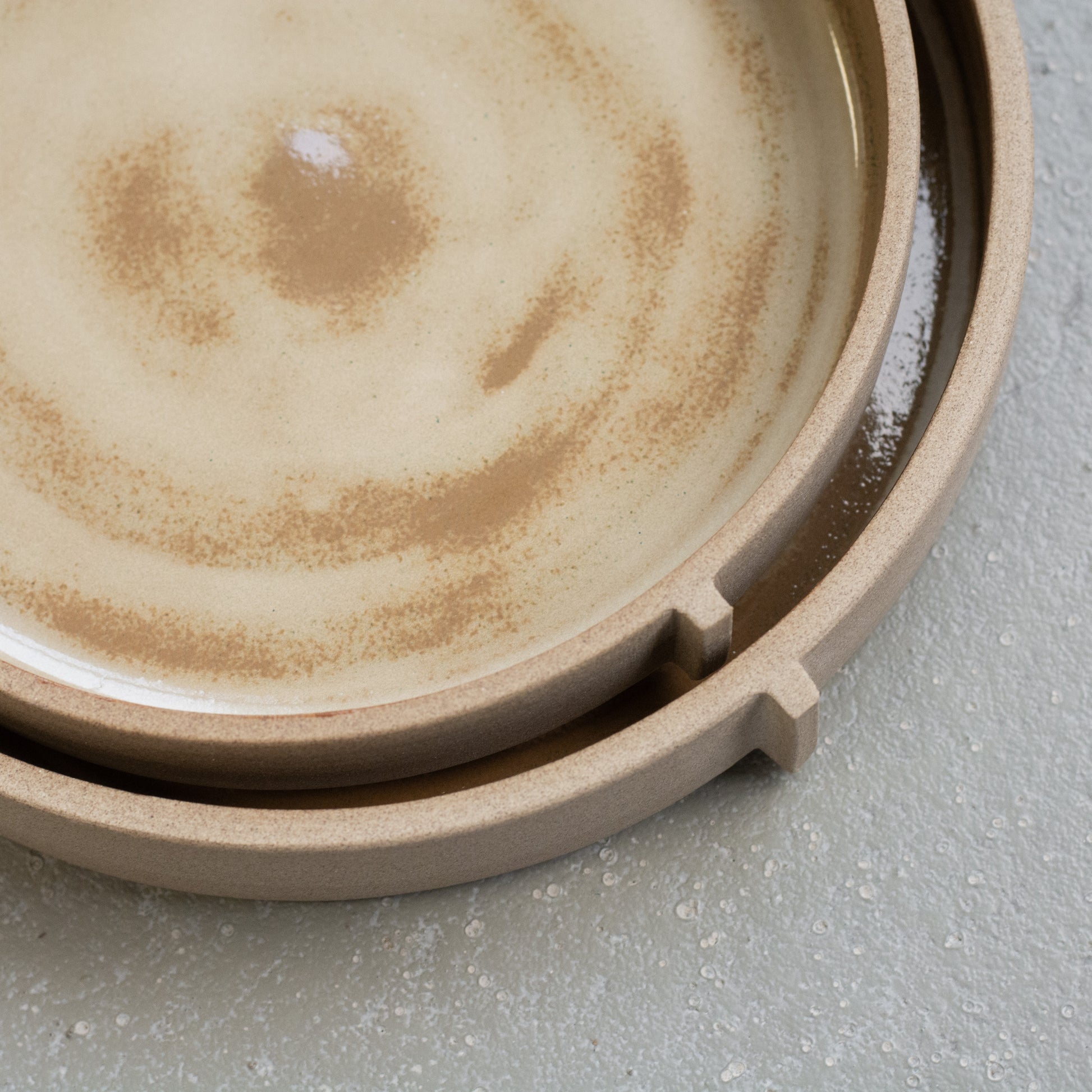 Met dit fijne serveerbord zet je echt iets moois op tafel. Gedraaid met toffee kleurige klei en afgewerkt aan de binnenzijde met toffee kleurige glazuur. De buitenzijde is onbewerkt waardoor het een mooie matte en natuurlijke uitstraling heeft.